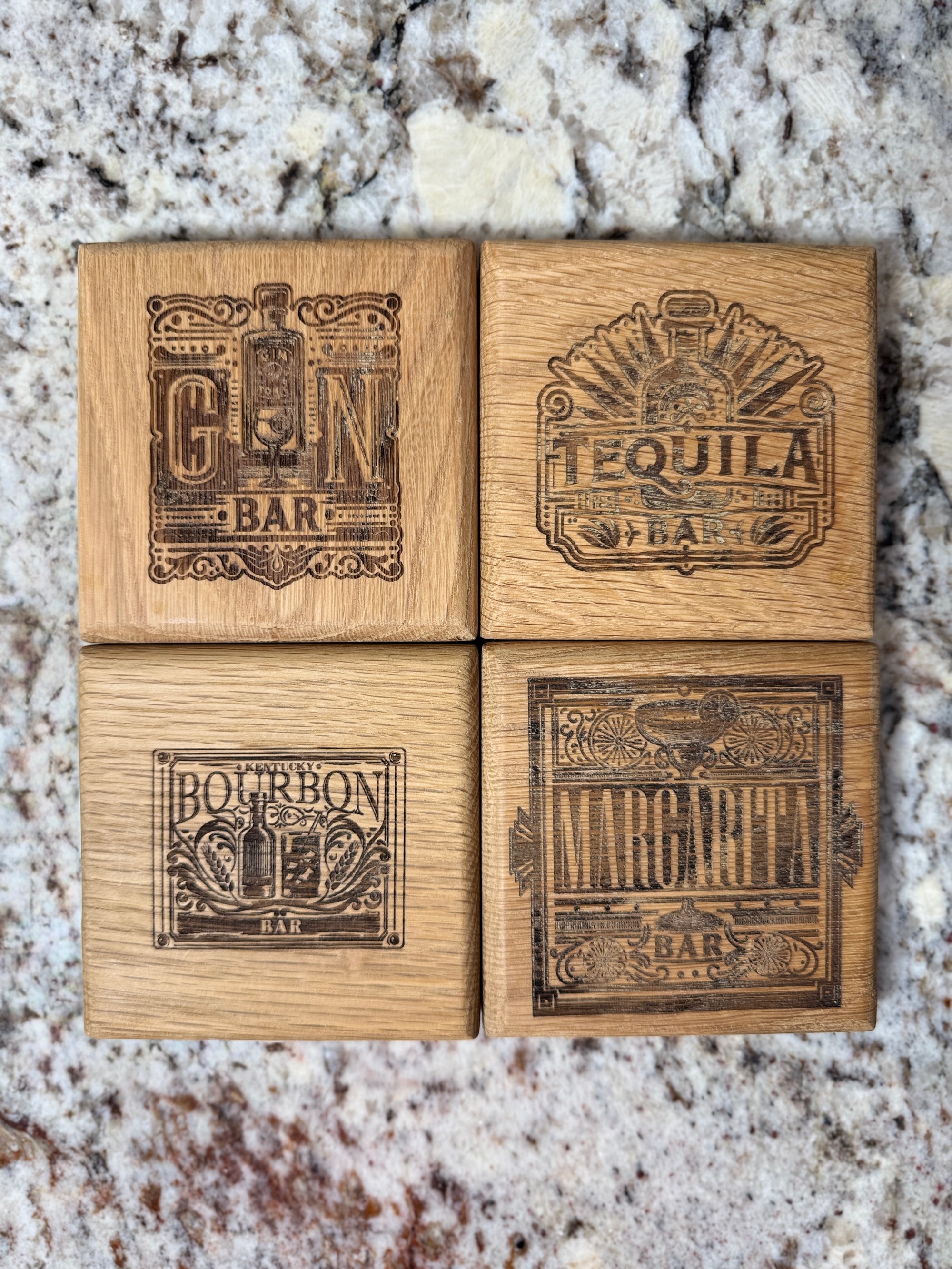 Raise the standard of your home bar. Each coaster is hand-cut from solid red oak and engraved with bold bar-inspired designs, giving your drinks a resting place that feels just as intentional as the pour.