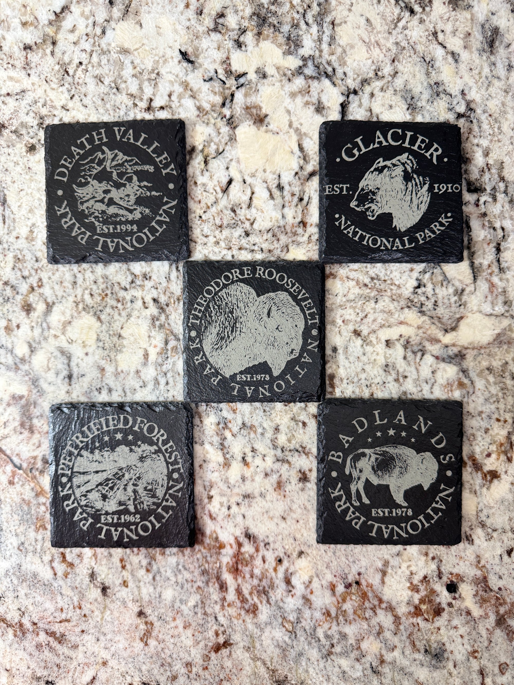 A great pick for anyone who loves the National Parks or enjoys adding meaningful details to their home. This square slate coaster set features crisp engravings from five parks — Death Valley, Glacier, Theodore Roosevelt, Petrified Forest, and Badlands. The bold artwork contrasts beautifully against the natural slate, giving each coaster a rugged, timeless feel.